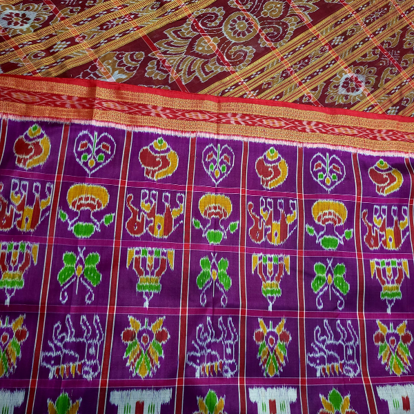 Experience the timeless elegance of Odisha’s Handmade Khandua Mulberry Silk (Pata) Saree – Nabakothi Design, woven with traditional motifs depicting nine auspicious elements. Crafted by skilled artisans from Nuapatna, this luxurious pure silk saree reflects cultural heritage and divine artistry. A masterpiece of handloom craftsmanship, it comes without blouse piece, perfect for graceful ethnic occasions.