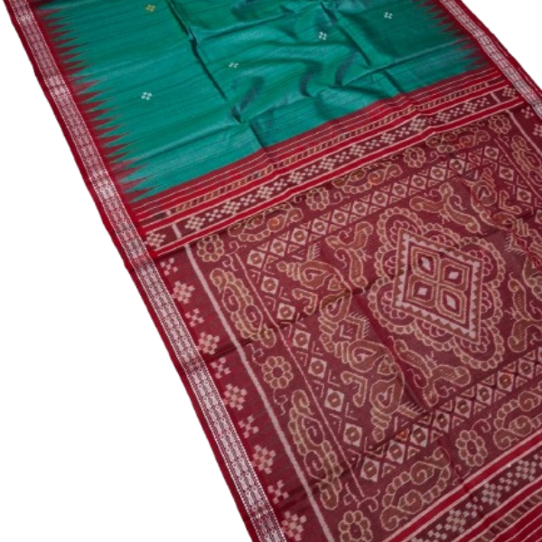 Adorn yourself in the exquisite charm of Odisha’s traditional artistry with this Pure Fine Tussar Silk Saree. Crafted with precision by skilled weavers, this saree showcases allover Big Pasapali Buta, symbolizing cultural richness and symmetry. The Dobby Border with Fish Motifs and Temple patterns adds a distinctive ethnic appeal, representing prosperity and grace. The Grand Ikkat Pallu further enhances the saree’s luxurious aura, making it a statement piece for festive, wedding, or celebratory wear. Its natural Tussar silk texture lends a soft sheen and breathable comfort, making it both elegant and wearable year-round.