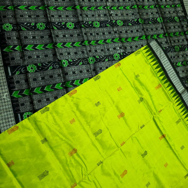 Bring home the timeless grace of Odisha handloom with this exquisite Sambalpuri Bomkai Pure Silk Saree. Crafted by skilled artisans, this saree features a stunning neon green body intricately embedded with traditional fish buta motifs, symbolizing prosperity and good fortune. The contrasting black-green aanchaal enhances its elegance, making it a perfect attire for weddings, cultural celebrations, and festive occasions. Designed with fine silk threads, it offers both comfort and grandeur, making you stand out with a regal touch.